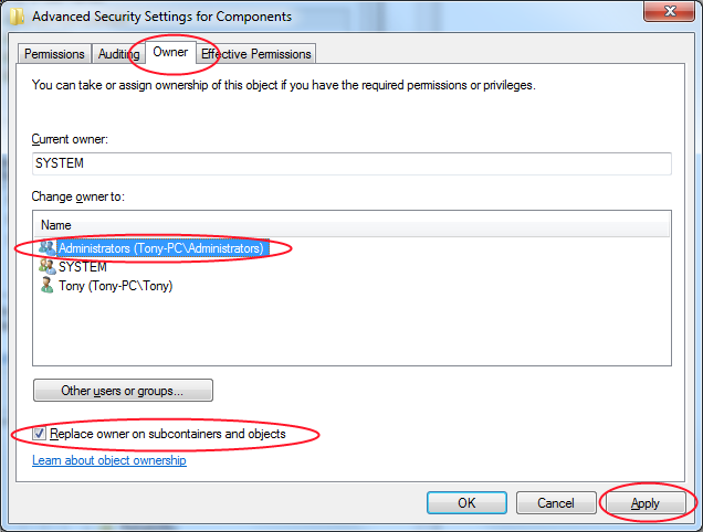 (14) In the "Owner" tab, check the "Replace owner on subcontainers and objects tickbox, select "Administrators" and click Apply: