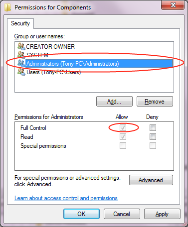 (2) In the "Group or user names" pane, select "Administrators" and in the pane below that make sure that "Full Control" is ticked under "Allow":