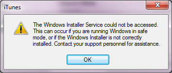 When installing or updating iTunes for Windows on a 64-bit Windows Vista or Windows 7 system, you may see a "The Windows Installer Service could not be accessed" message, as per the following screenshot: