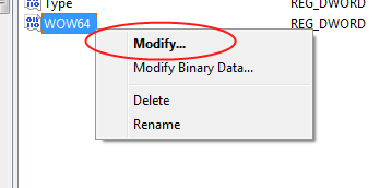 (8) If that value is present, right-click on WOW64 and select "Modify", as per the following screenshot: