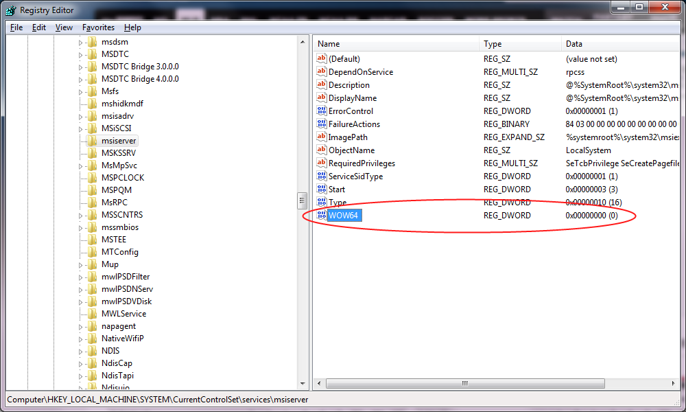 (7) In the right-hand pane of Regedit check for the presence of a WOW64 REG_DWORD 0x00000001 (1) value as per the following screenshot:
