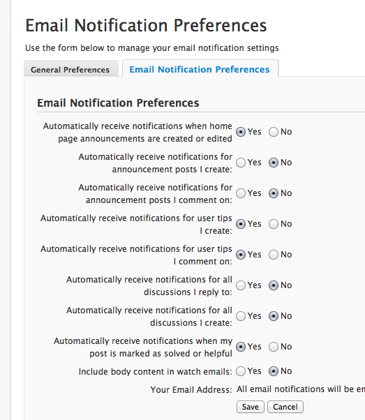 Note: The Email Notification Preferences have no effect on any Email you are currently receiving, they only affect what will happen. To stop current Emails you need to delete them from Email Notifications.