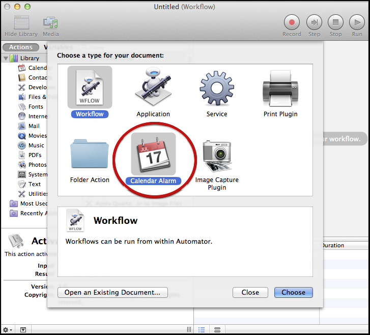 If it doesn't, select Open FIle for the Alert, click the second line under it and select Other to get a prompt to locate the Automator alarm you created above.