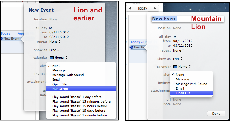 Apple removed the ability to execute an AppleScript via an alert in Calendar on Mountain Lion: