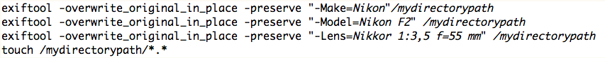 exiftool -overwrite_original_in_place -preserve "-Model=Nikon F2" /mydirectorypath