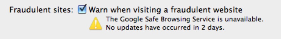 Have the Google Safe Browsing enabled. If it's not being updated this is what appears in Safari preferences.