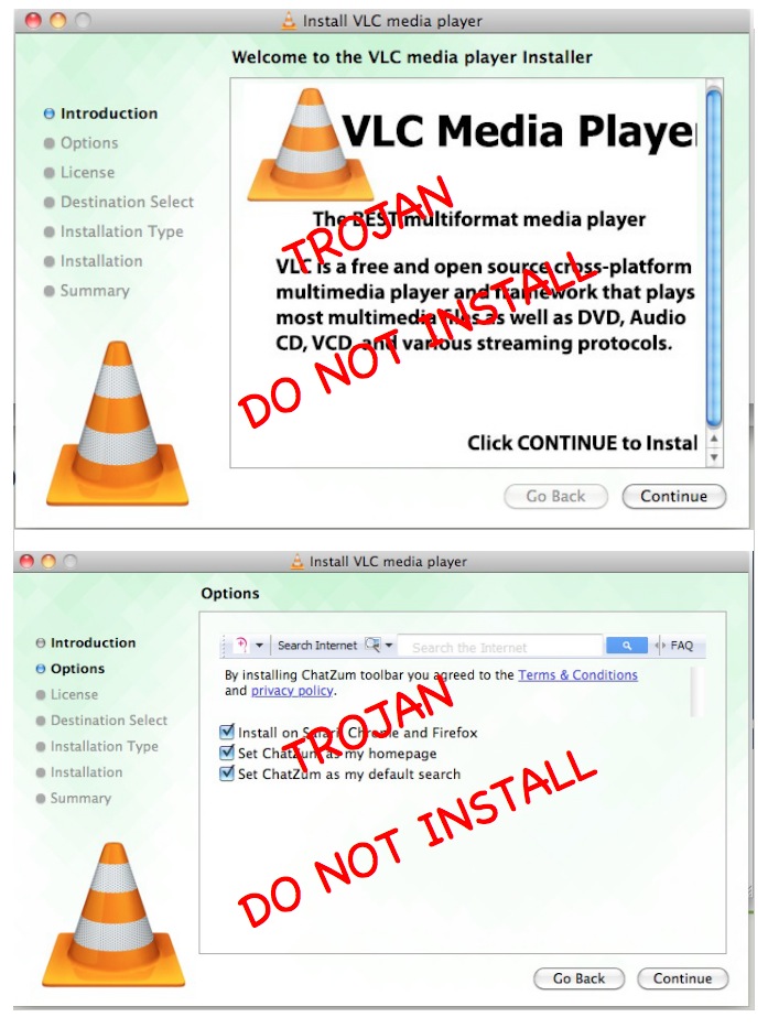 OS X will display the typical app warning message written completely backwards to play on your confusion, do not install!