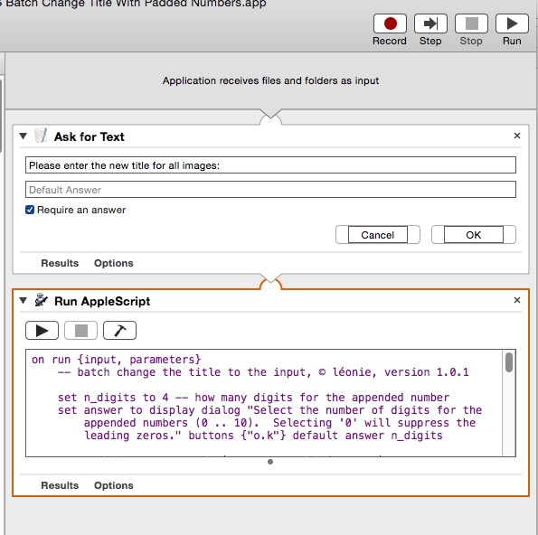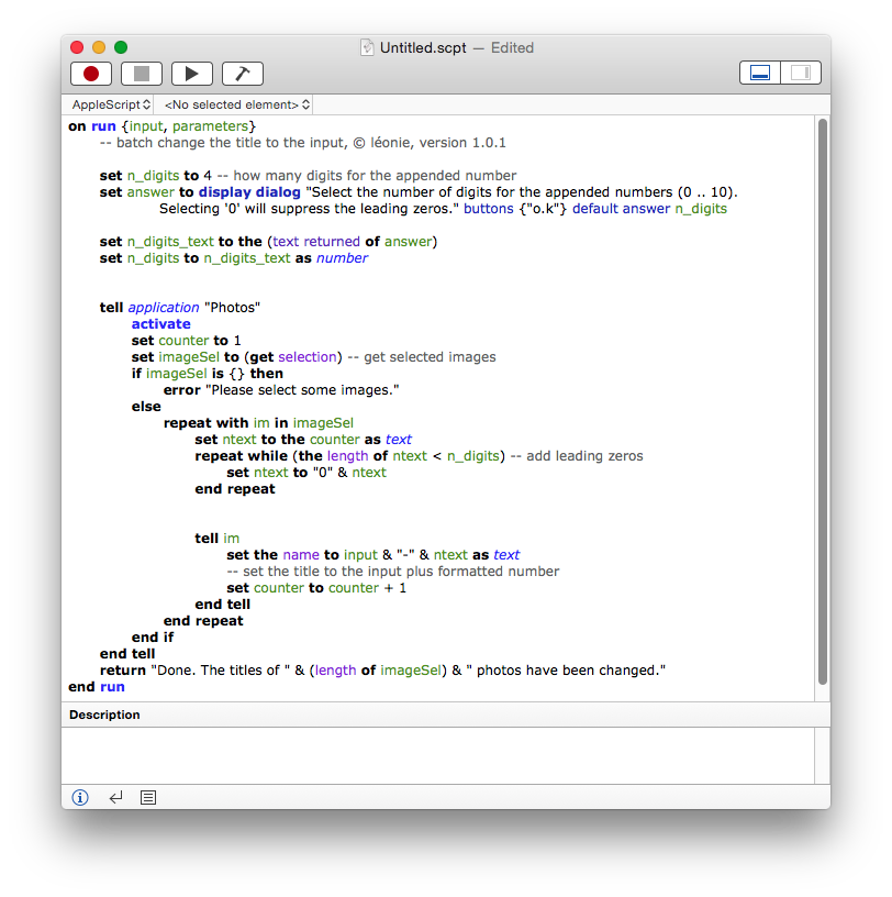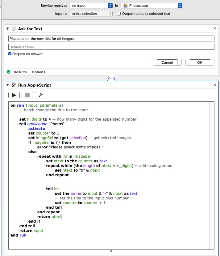 This script will prompt for a new title to be applied to all photos and then change the title to the string, with an added number.