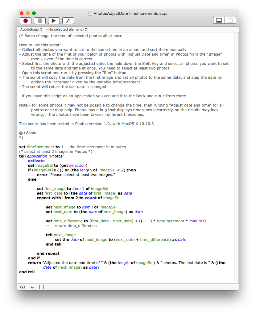How to use this script:- Collect all photos you want to set to the same time in an album and sort them manually to the sequence you want.- The album needs to be a toplevel album, not an album inside a folder.- Adjust the time of the first of your batch of photos with "Adjust Date and time" in Photos from the "Image" menu, even if the time is correct. to ensure it has an EXIF capture date.- Open this script and run it by pressing the "Run" button.- The script will copy the date from the first image and set all photos to the same date, and step the date by adding the increment given by the variable timeIncrement.- The script will return the last date it changed