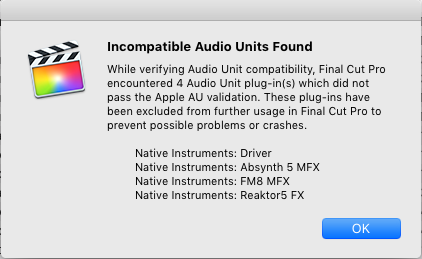 Three weeks later: OSX 10.11.1 is released. It fixes the AU validation problem BUT we still get the above dialog when launching FCPX.