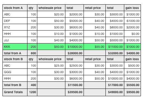 Now add another row to the 'Stock from Supplier A' table (KKK, highlighted in green for clarity). The tables below politely move down to make way for the new row. The totals automatically adjust.