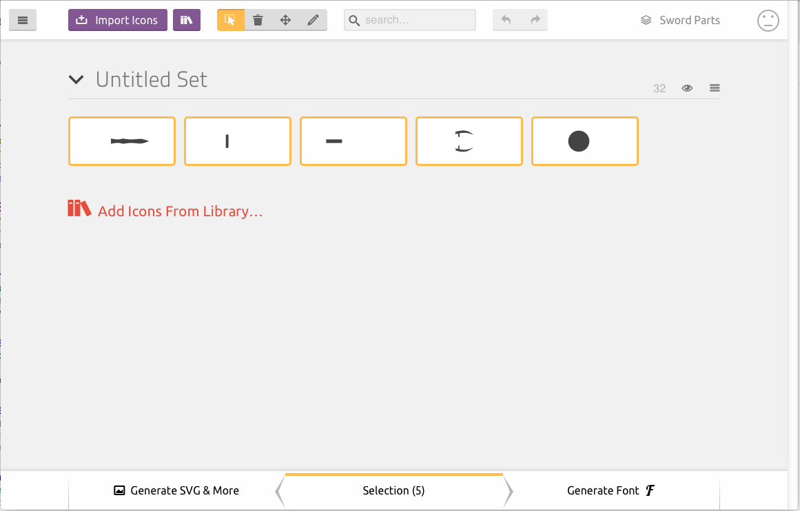 When you open IcoMoon, click on the Import Icons button. Locate where you saved your SVG model files in the file browser. Shift or command click the multiple files to upload in one action. Once uploaded, you should see small thumbnails of each "layer". When uploaded, the newly added items will be unselected — you'll need to select all of them to be compiled into a font.