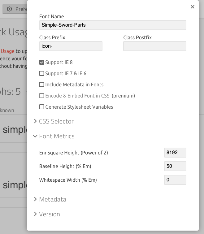 Give your artwork a Font Name. You can leave the Class Prefix and Class Postfix at their defaults. You can unselect Support IE 8 or leave it on, it's meaningless (I just LOVE saying that 😉). Same with CSS Selector - not going to be used.