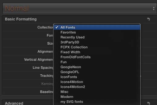 That is SO cool! You can organize all your fonts in Font book with respect to how you work in Motion (IF ONLY FCPX had this!!!!) You can see how I've organized some of mine below (kind of messy - but I can live with it. I keep my 3D font projects in specific collections, e.g.: Icons4Motion, my SVG fonts, etc.)