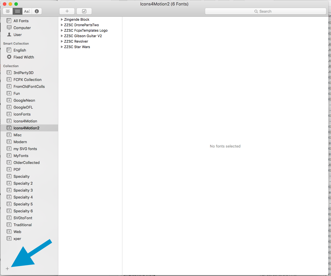 Give your Untitled collection a name (suggestion: SVG Models or 3D Models, whatever floats your boat.) Find the font you downloaded from IcoMoon and drag it from the Finder into the blank column between the collections column and the display area on the right.