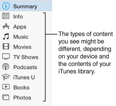 Select the type of content you want to sync (for example, Music or Apps) in the sidebar on the left.