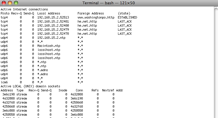 The above are screen shots of connections my computer seem to be having. Only one newly created user is logged into. firefox was used to browse google and apple and yahoo/hotmail mail. it seems i am getting connected to strange IPs and some of these may not be advertising. i closed all browsers and waited for some time and it seems now washington post is connected. at one point eclipse ide was open and when i closed it most of the connections that were in second pic were gone. Why doesnt apple's netstat show the foreign connection correctly? why does it truncate or chew up the address? or is it showing some 'given name' of foreign address?