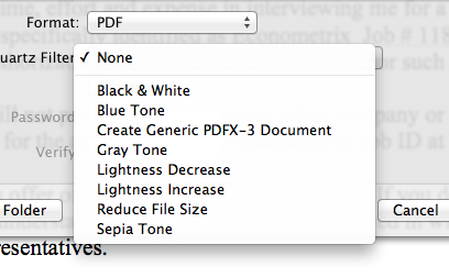 These filters produce much better (better being in terms of consistency, file size and quality) than the filter Apple includes with Leopard (and maybe Tiger ?).