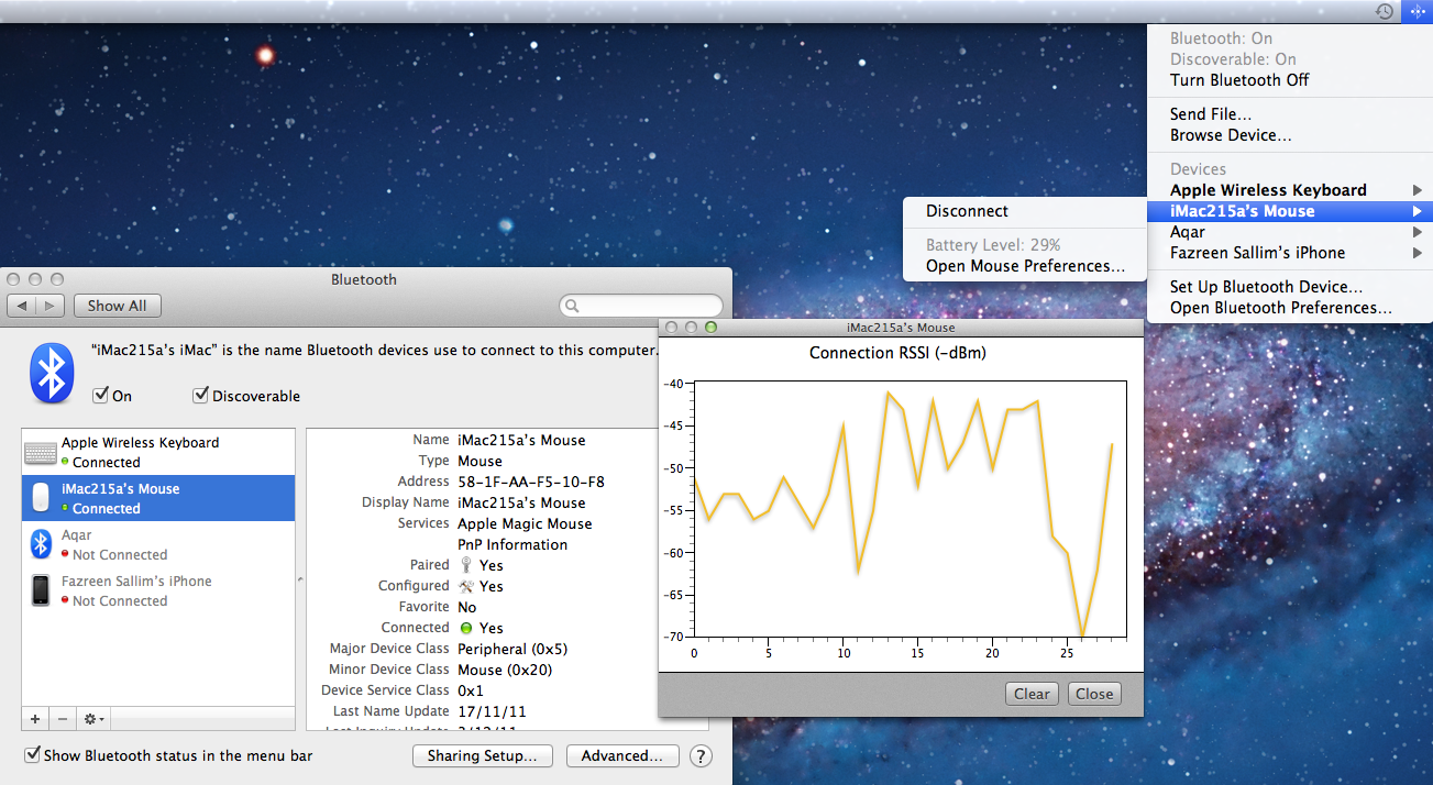 There, a cluster of 4 demo iMacs were placed close to each other, all operating with the BT keyboards and MMs. I spent some time checking out the MMs. None of them exhibited any lost BT connections. In checking out one MM, I noticed that the battery level showed 29% - yet it could achieve an RSSI (Receiver Signal Strength Indicator - go to System Preference, Bluetooth, select MM, click on icon at bottom, at the right of the +/- buttons and select Monitor RSSI) in the region of -40 something dBm. My MM with a battery level of 87% could never achieve an RSSI of -40 something dBm (best around -50 something dBm). Attached pics for comparison.