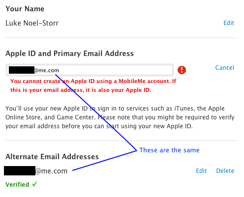 Absolutely ridiculous, I have to hold onto my old email address just for Apple, when all I want to do is switch to their service. It means I can get all my emails to my @me.com address, except ones from iTunes and other Apple Services. Aaaghghghhhhh!!!