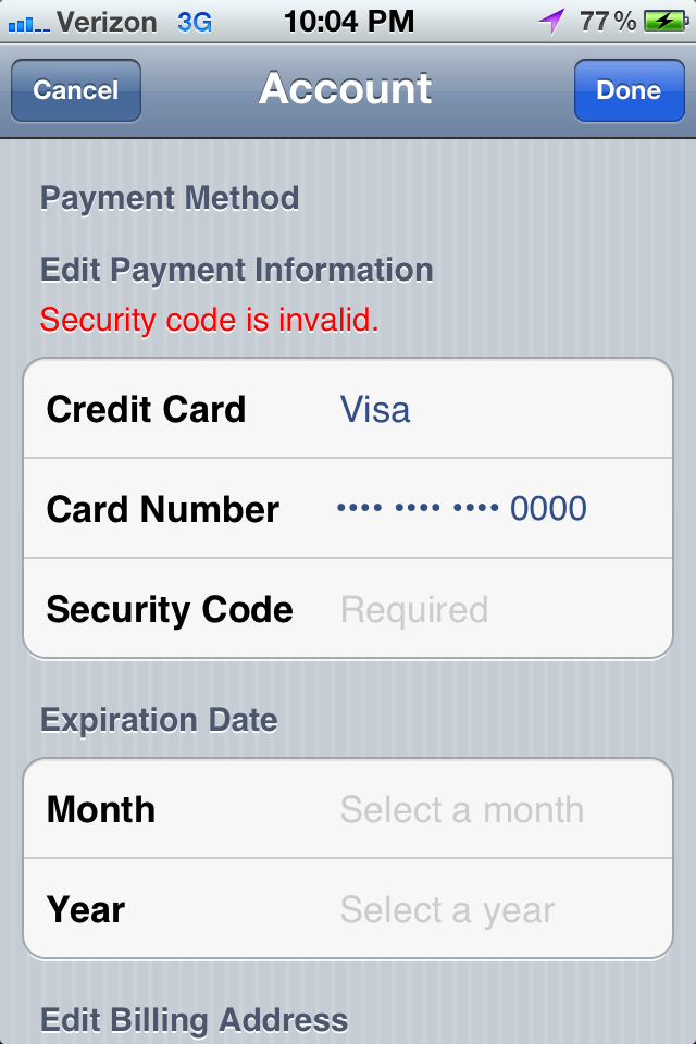 Hello! I have been having the same problem on my iPod Touch. It keeps saying that my security code is wrong. But do not worry! I have found a solution! Buy a prepaid credit card. Ex. Vanilla visa. Put the prepaid credit card information onto your account. Then save it. After you save it, go back and press on the credit card section. Choose "none". After that, put in your regular credit card and should be solved unless there is something wrong with your credit card