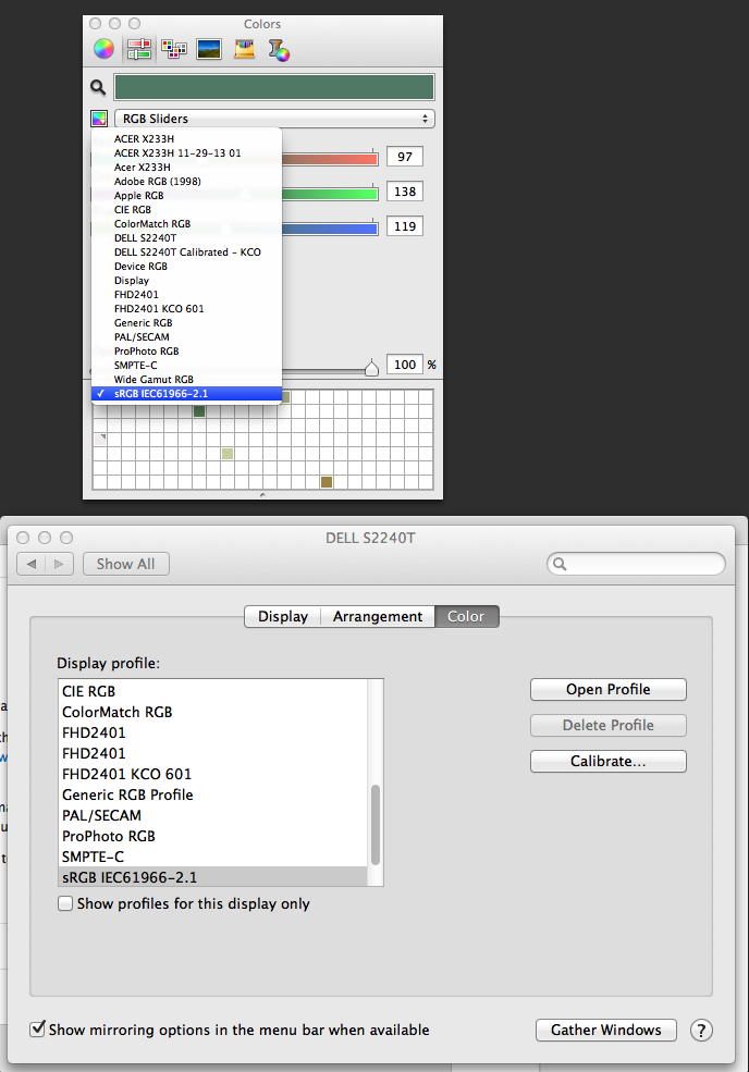 As for preferences and calibrating the display, everything looks fine to me except that the Color Picker picks wrong colors. I think my computer is displaying correctly the wrong colors that it picks, since I confirmed in Rapidweaver that the actual data is wrong in the CSS. I don't understand why Photoshop Elements 4 doesn't show web-safe colors correctly though. But the problem isn't just that the colors LOOK wrong, the numbers ARE wrong, so I don't understand how trying to recalibrate would help. My color calibration is set on standard and I wouldn't have a clue how to "improve" it anyway.