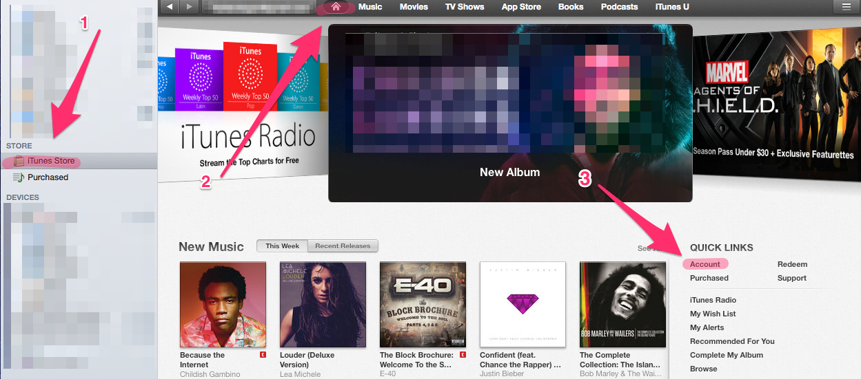 If you're a visual learner, this may help navigate the iTunes Store and Account areas: