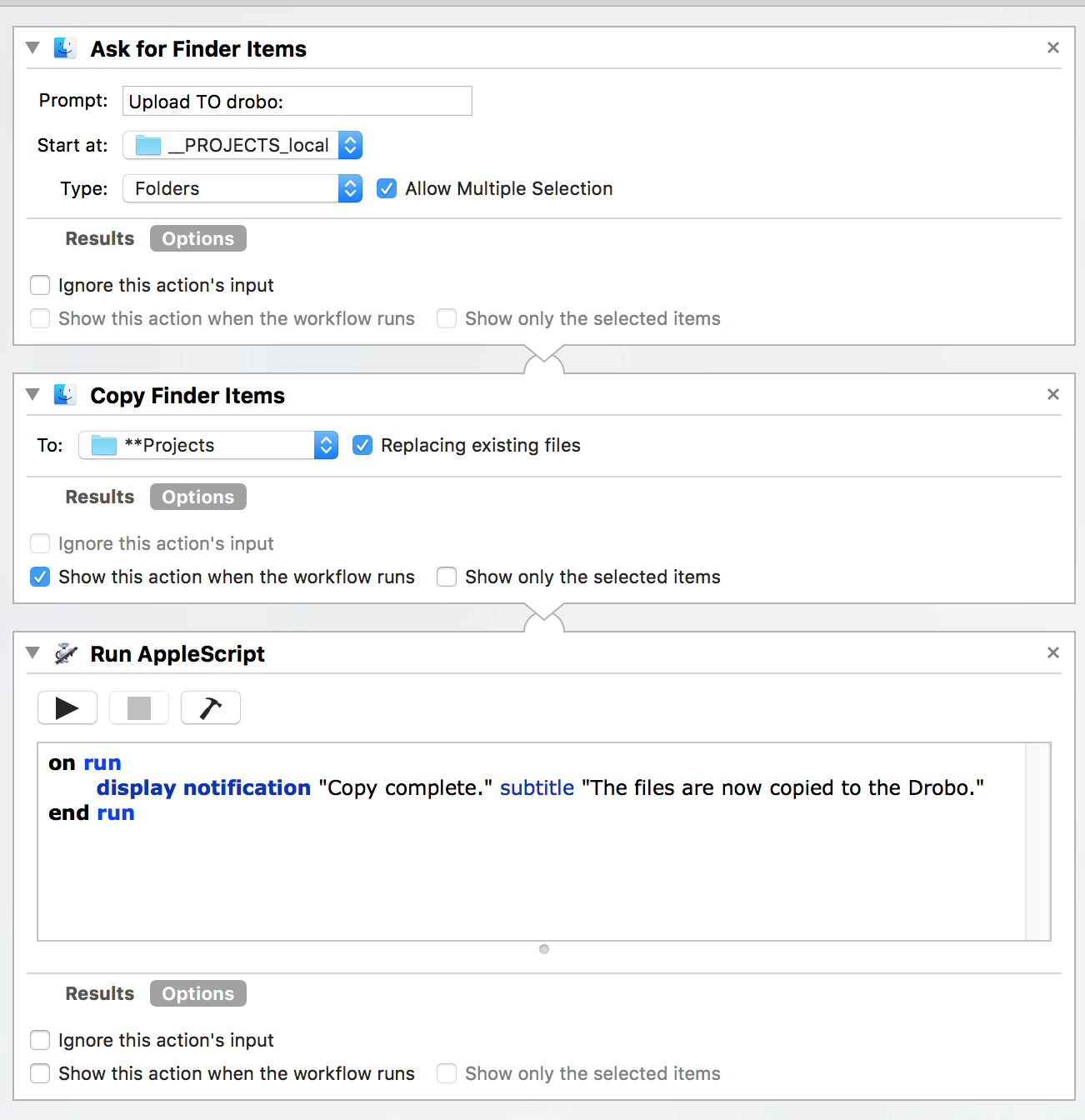 I realize I am necro'ing this thread after 5 years, but I was looking for the same thing and didn't come across much. About the best you can do is add an AppleScript notification or alert dialog to the end of the flow. Here is what I did for copying files up to my Drobo (NAS).