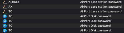 The image above is from the Keychain app on my Mac mini. At the time I took this screenshot, I had three AirPort base stations on the local network:
