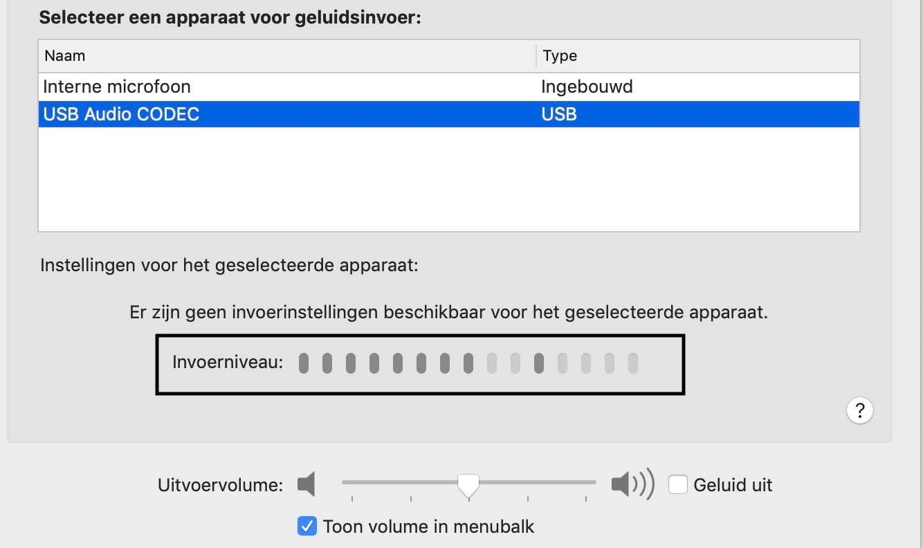 Strange thing is that I can see the input signal in the overall System preferences when I choose for the USB-device as input.