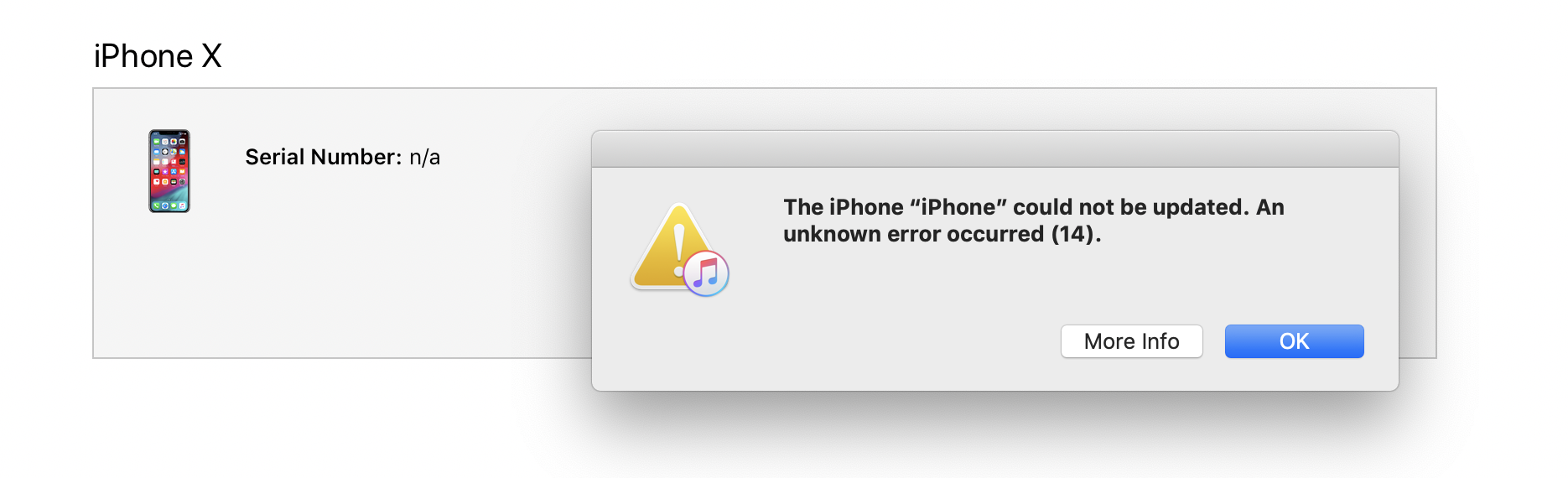 I've used iPhone for many years and really love iOS. I have never got problem until the beginning of 2019. I got the problem like picture below that iTune show unknown error occurred (14) and now my iPhone X cannot use anymore. I went to i care and they keep telling me to restore which all data will be deleted, but I really need my data and memorable photos back. I feel so disappointed with firmware update if I have to loose all my data like this. Please kindly help me how to solve this problem.