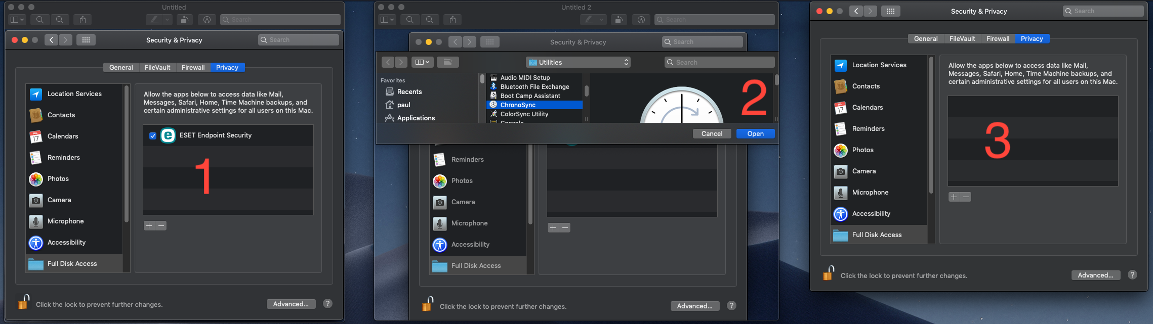 Upon installing Chronosync to move around some larger files I was informed the app needed Full Disk Access so I proceeded to add the app like I had successfully done with ESET... but after selecting the app and clicking 'Open' not only did Chronosync not load in the allowed Full Disk Access list, but strangely ESET disappeared from the list (although it comes back after a reboot).