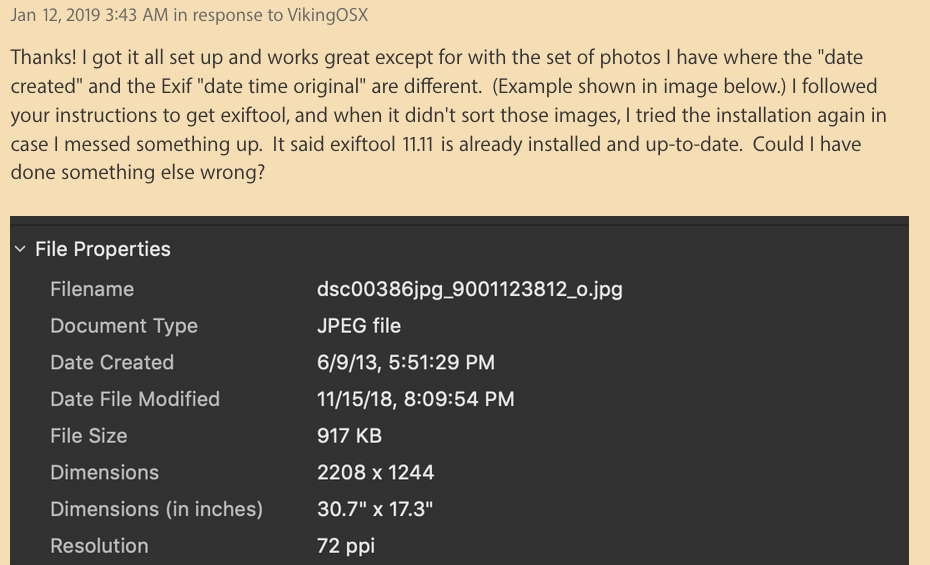 It seems like this might be possible but I haven't found exactly what I'm looking for online... I have a ton of pictures and videos that I'd like to sort into folders based on the date the pictures or videos were taken. Can I automate the whole process of creating the folders named by date and then moving the files into the correct folder? I just discovered automator today and have no experience with apple script so I need specific directions. :)