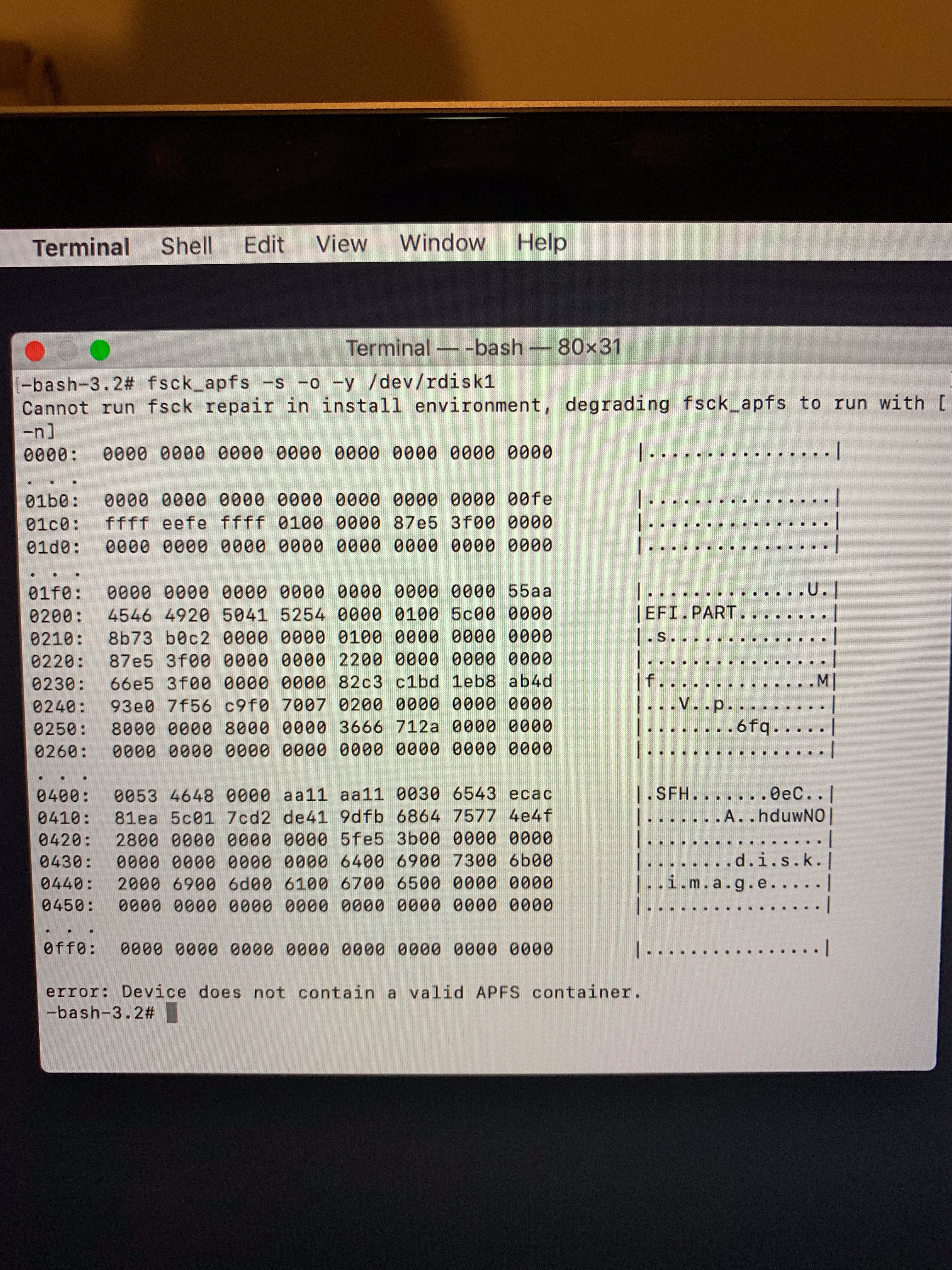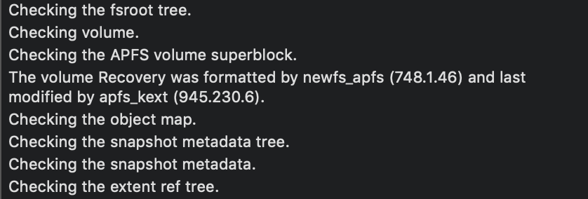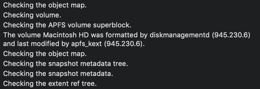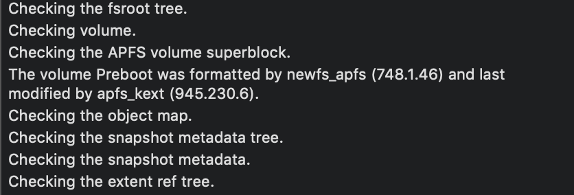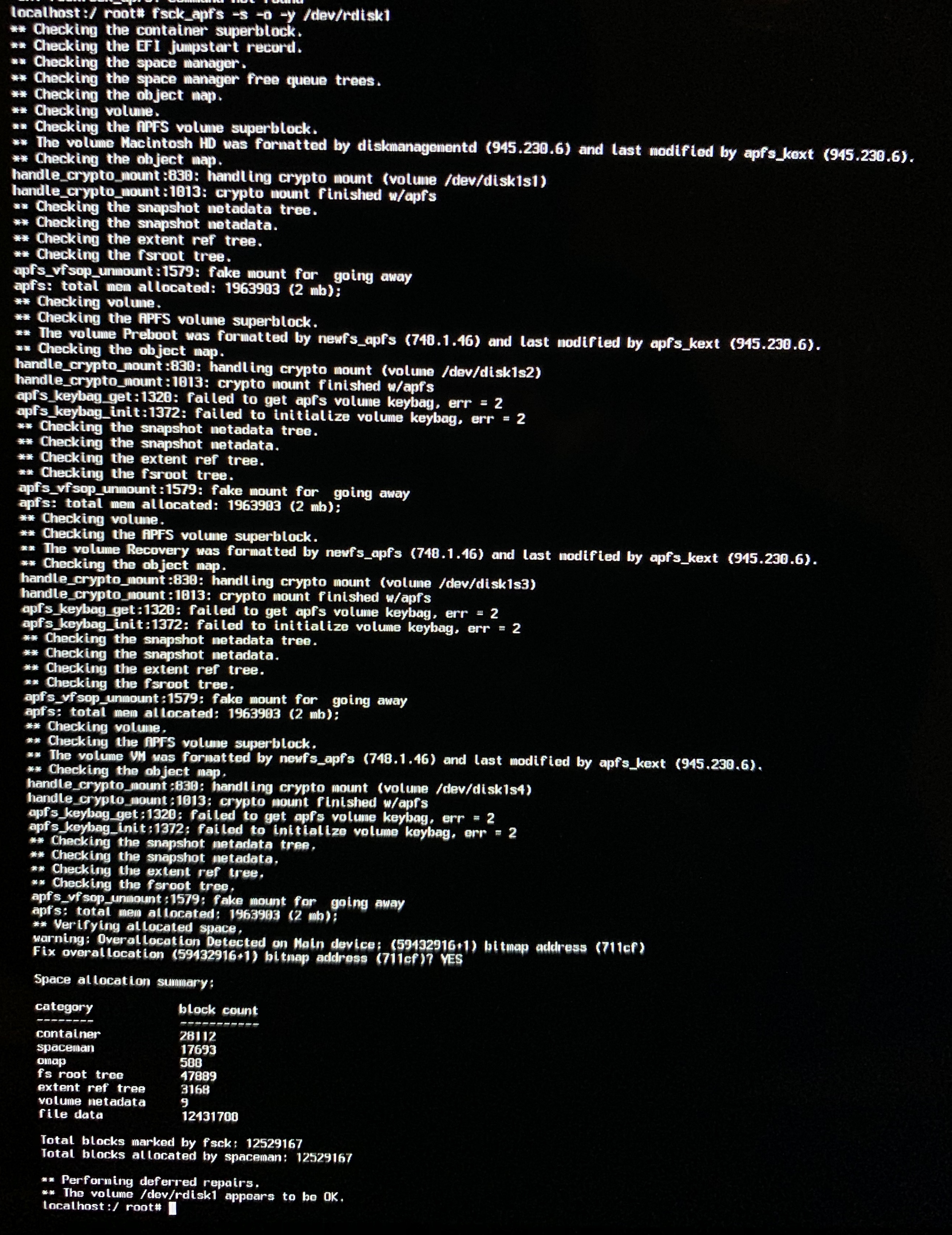 - Restarted in Single User mode (Cmd + S) and typed in the commands to repair the disk,