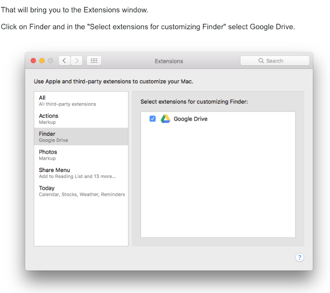 Currently, when I right click to share a file from Finder, there is no option to use Google Drive. I have enabled the extension for Backup and Sync from Google in settings, but this has not made a difference.