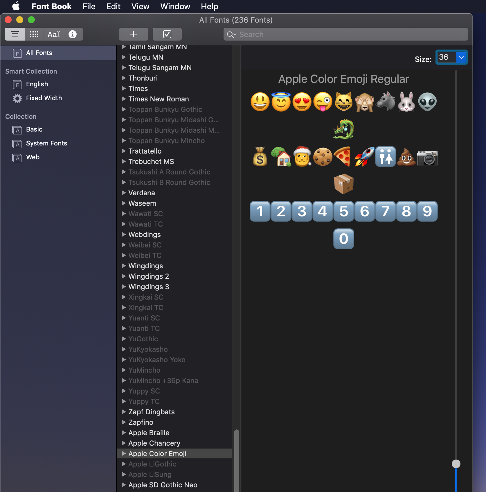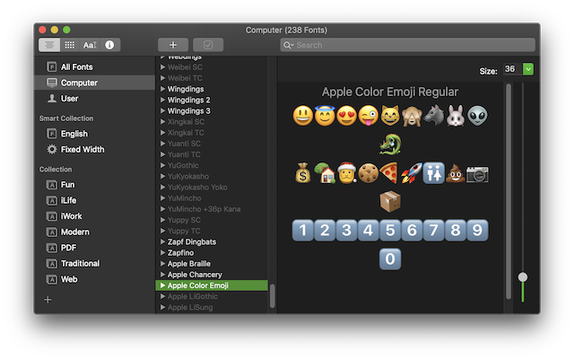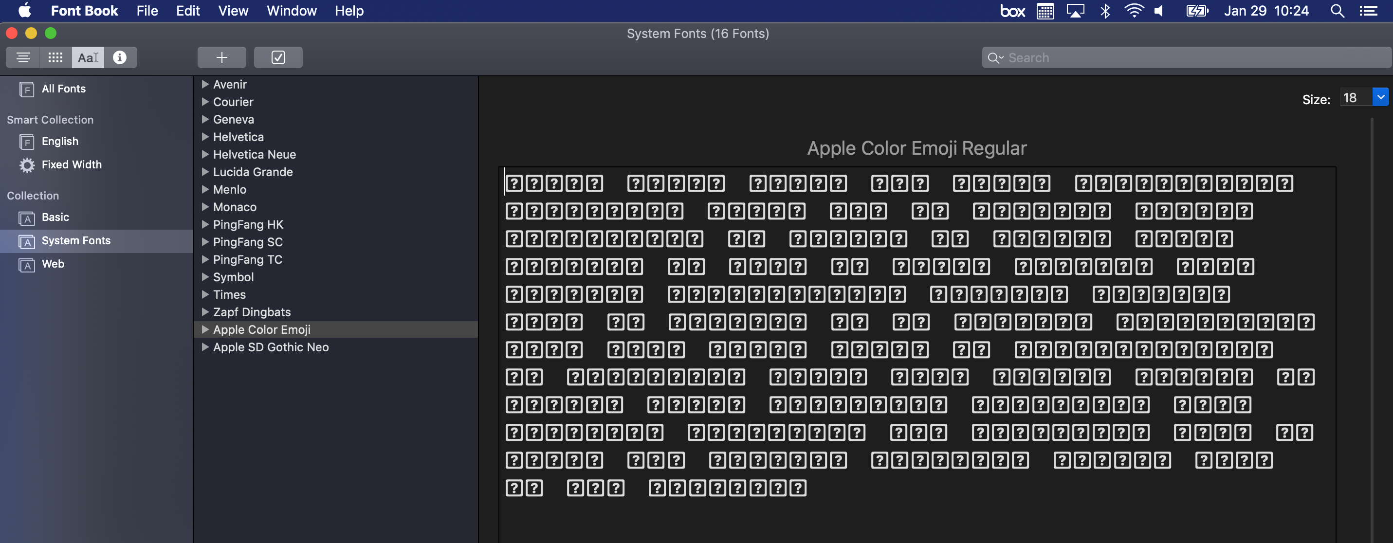 In FontBook, the Emoji font displays normally when viewing in Repertoire and Sample views, but not in Custom view. Emojies display normally in Messages preview/list column, but not in the messages themselves. They show as a boxed question marks.