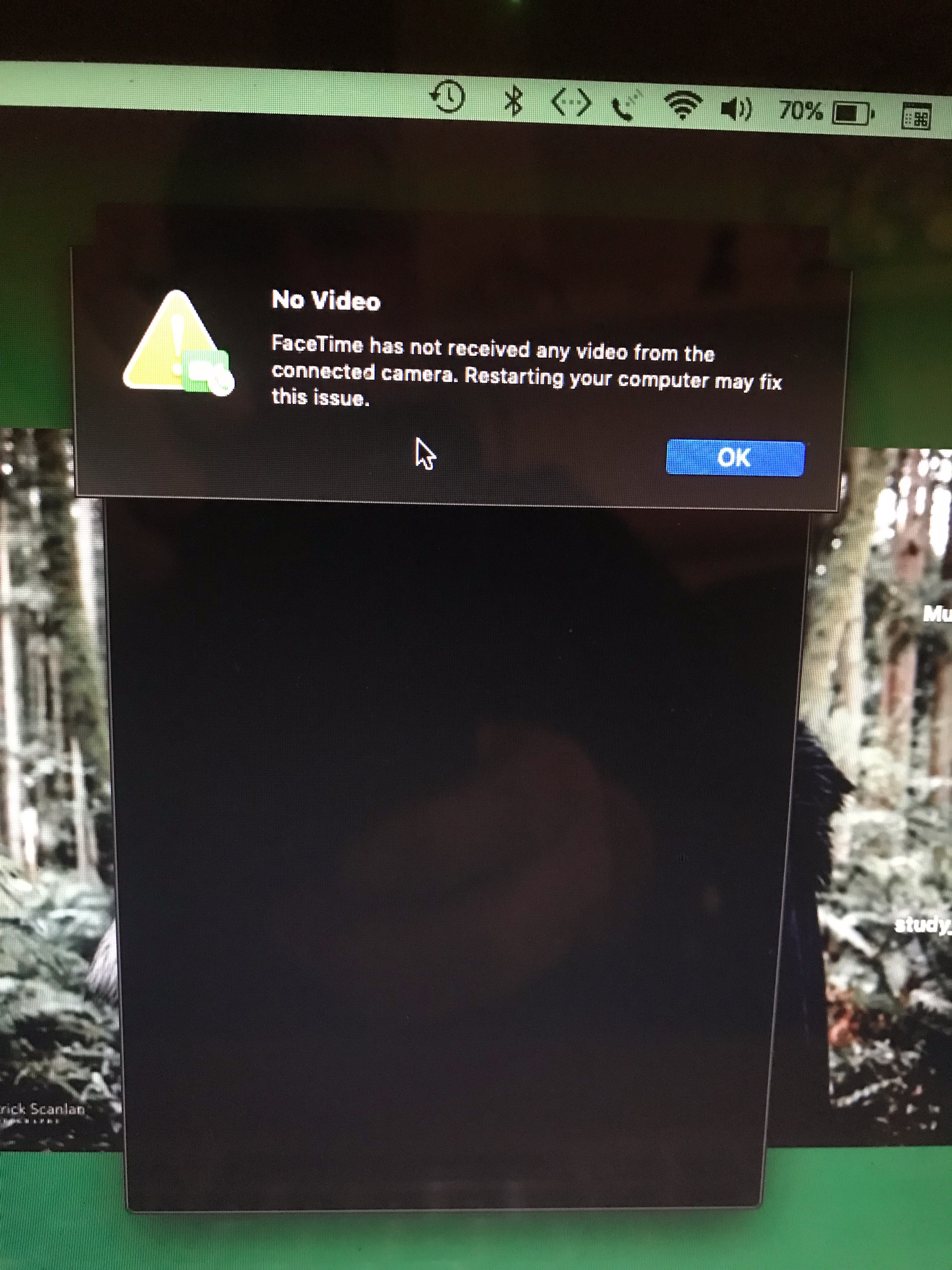 FaceTime screen is black, error message says "FaceTime has not received any video from the connected camera. Restarting your computer may fix this issue." Restarting didn't help.
