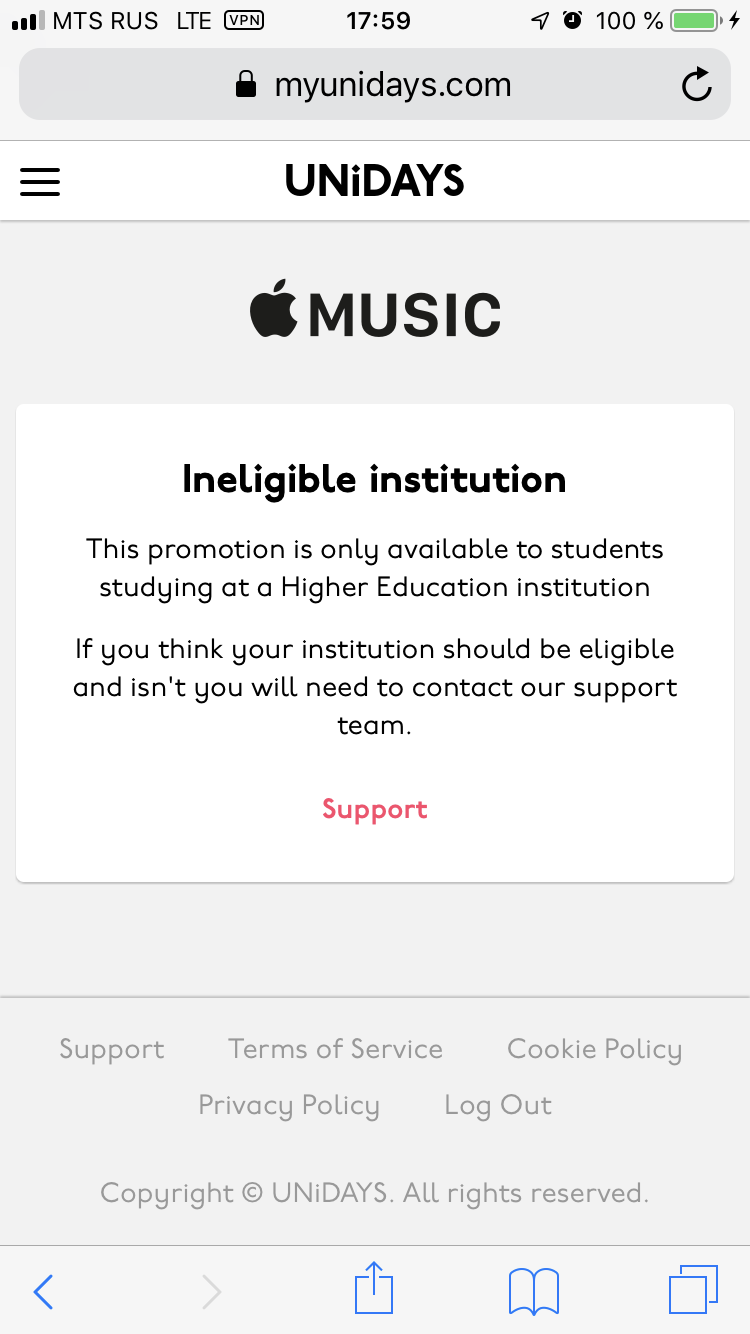 But the problem is that when I click "confirm student status" in the Apple Music app, I go to the website myunidays.com where I write that this subscription is available only for students of higher education. And Unidays customer service told me about it. But Apple's rules say that students in both higher education and secondary and technical schools are eligible for a subscription Apple Music.