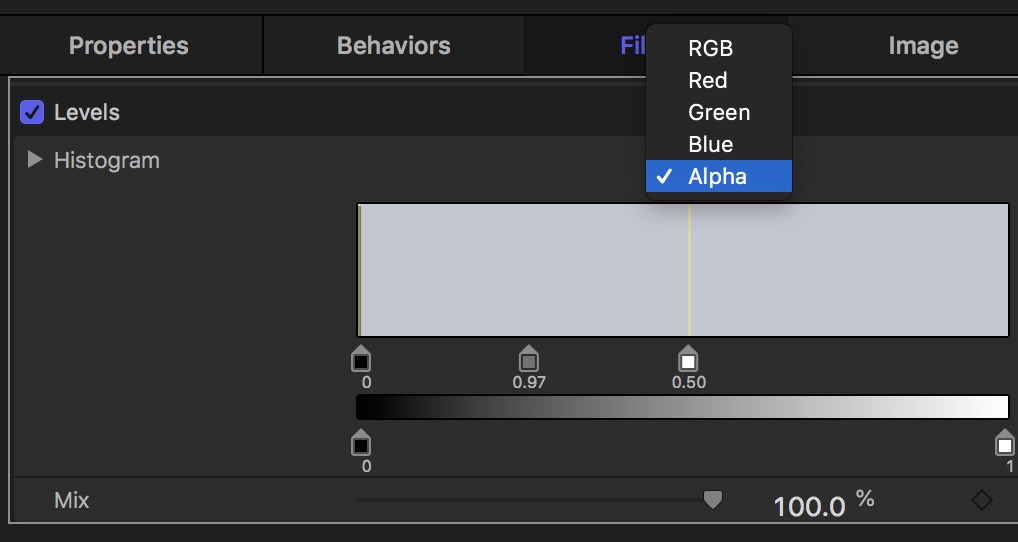 While this "faded appearance" is somewhat annoying pertaining to this specific image, in general, there is a general preference for the alpha transparency to be a little more liberal [to avoid a kind of fringing along the edges of the alpha channel]. Motion changed after v.4. In the old days, color was 8-bits per channel (including alpha), and that is like *most* graphics applications. With Motion 5, Motion went to 32-bit floating point color *all the [d**n] time* with no option to go back to the older color system. This can be somewhat annoying from time to time because some of the original filters that come with Motion are still 8-bit color... :P This can lead to other issues like "banding".