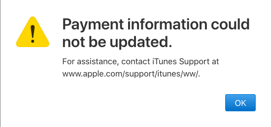Apple ID site will not let me update my payment method. Why? Here is the screen shot of the pop up.