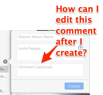 When I created a Photos "Shared Album", it let me type in a comment. So, I wrote in some of the people. I by mistake wrote So-and-so's niece, but it was their grandchild. How can I edit this initial comment?