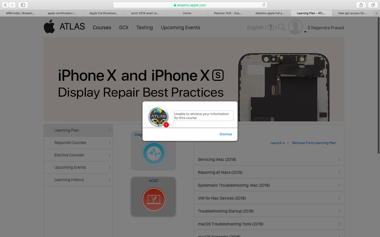I can login to the https://atlaslms.apple.com, view the courses, when I click on launch a course I get an error" Unable to retrieve your information for this course. please see the screen shot and let me know how can I get access for the courses.