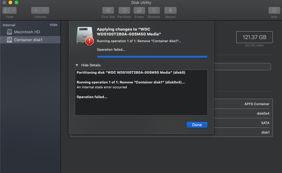 The 121GB APFS container needs to be erased and merged back into macOS. Post the output of