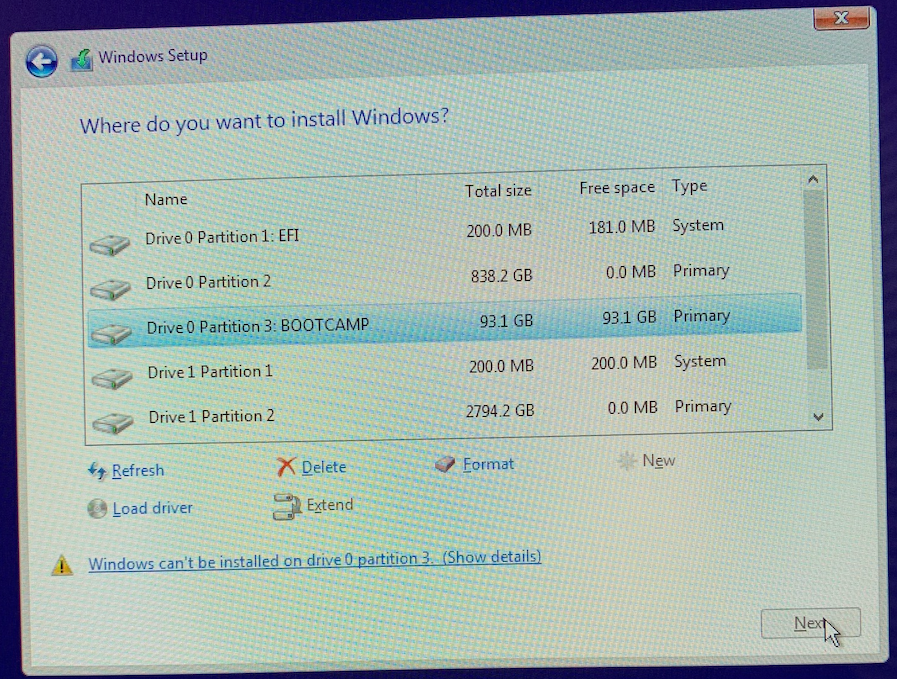 I'm having an issue where I try to dual boot windows on my iMac and i get issues. I go through the process to create a windows bootable disk and the windows support software. The iMac reboots into the windows setup. I'm presented with the "Where do you want to install windows" screen. I get a message that says "Windows can't be installed on drive 0 partition 3. (Show details)." When I click on the message link, it gives me the message, "Windows cannot be installed to this hard disk space. Windows must be installed to a partition formatted as NTFS." I close out of the windows setup and boot back into macOS and see the Bootcamp disk. I select the get info and it shows the disk is FAT32. I'm hesitant to try to format the partition as NTFS while i'm in the windows setup. I did this one other time and it messed up where I couldn't even use bootcamp to remove the partition. I had to run some sudo commands to manually delete and resize it back and then run bootcamp to remove it.