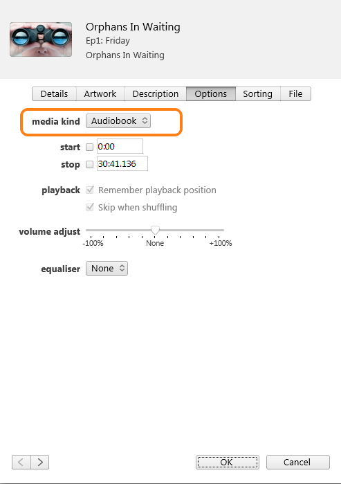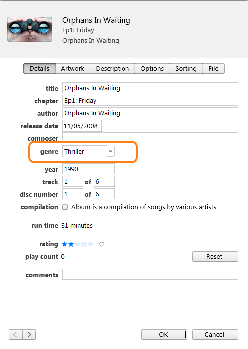 In the example above (Orphans In Waiting), this will be listed in the Audiobooks section of my iTunes Library. It will not appear under Music. The genre (or type of story) of this audiobook is a thriller, as noted below: