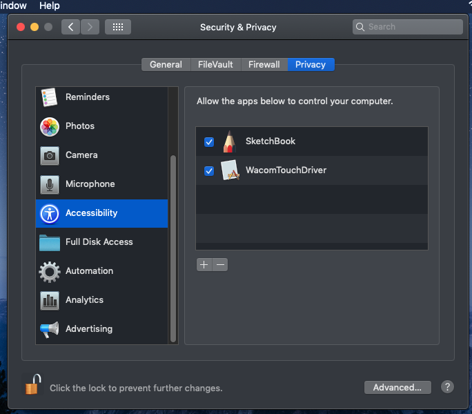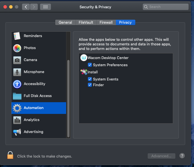 The only time the computer has asked for permission for Wacom to control/access things was the first time I got my laptop back from getting repaired and using the original CD to install the original drivers.
