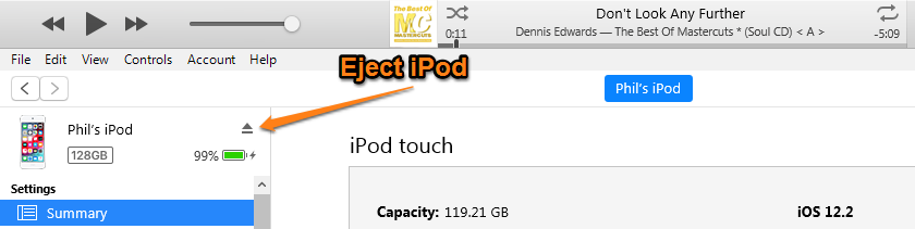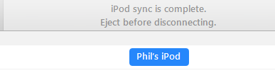 But not always. Sometimes, iTunes may simply revert to showing information about the song it was last playing. If you are not sure whether a Sync has competed, click on the iPod icon at the top of iTunes (the one I've previously mentioned) and look for the eject icon: