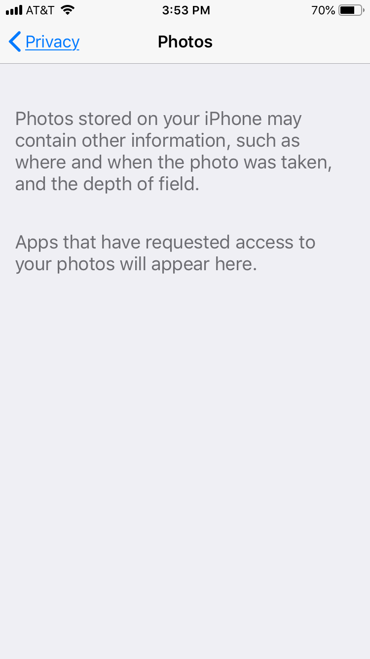 Iphone will not allow any access to photos from any app. I have reloaded all apps, updated ios, done all the advice online. It never shows any apps requesting access or when I try from the individual app it takes me to the settings page to enable photo access yet there is no photo on/off toggle on the screen at all. Help?