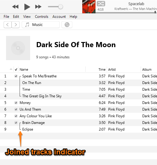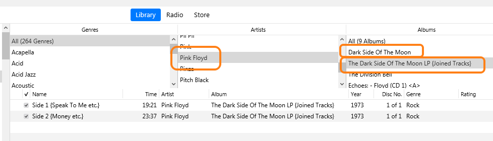 As you can see, I have two copies of Dark Side Of The Moon in my Library. The first one in that list has each track as a separate song (you cannot see them in that picture). The second version, which you can see listed below the artist and album columns, is named Dark Side Of The Moon {joined tracks} and has only two songs: