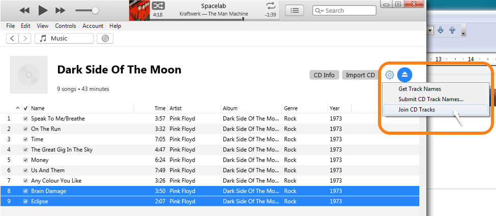 - With the CD in the draw and seen in the iTunes Import CD window, select the tracks you want to join. Note the difference on the Settings option menu (the gear wheel to the left of the eject CD button) between the following two screenshots: